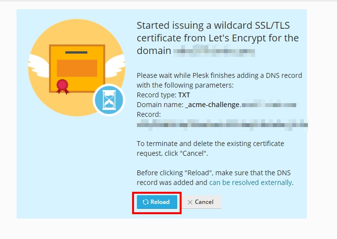 5. The system will display a message that In the process of adding a TXT Record, press Reload (only for wildcard creation).