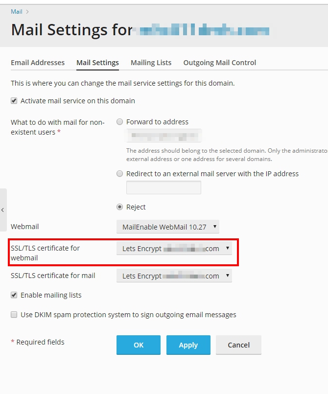 8. Check SSL settings for Webmail by going to Mail Settings, then in the SSL/TLS certificate for webmail section, select Lets Encrypt yourdomain.com as shown.
